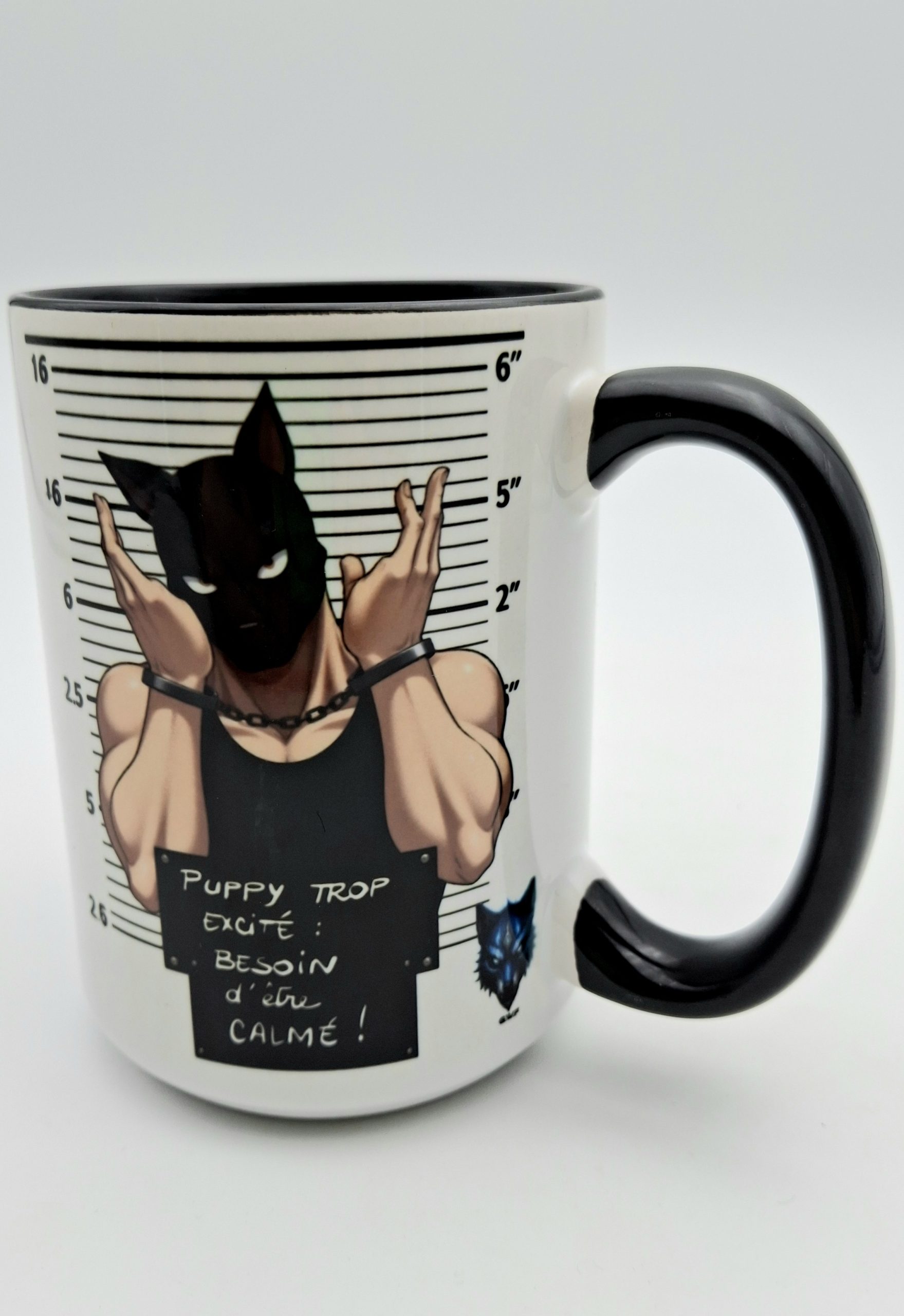 Avec ses visuels décalés façon “photo de mugshot”, ce mug met en scène un puppy malicieux, menotté, collier au cou et bien trop excité pour rester sage. Chaque face illustre une attitude : du puppy à calmer, au vilain puppy en attente de correction.