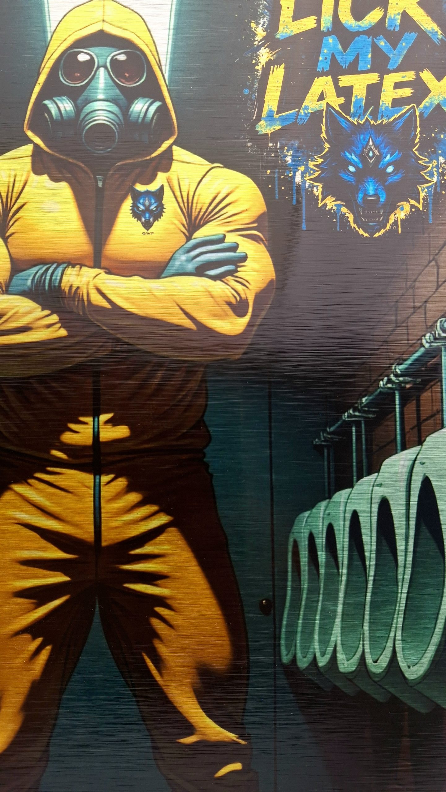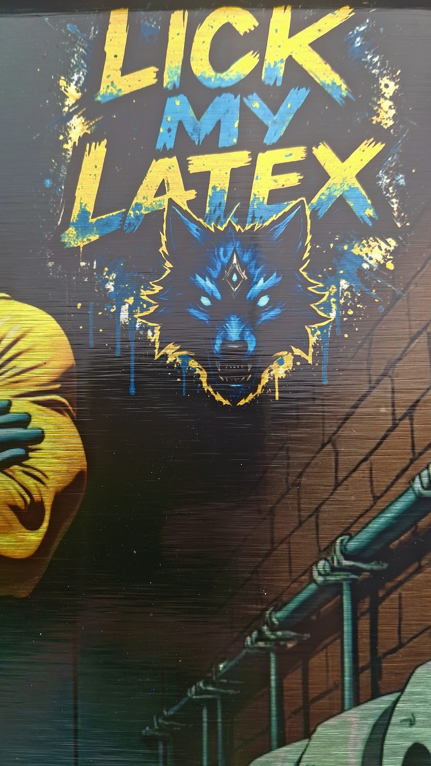 Le slogan explosif LICK MY LATEX pulvérise le mur. Un appel clair à l’obéissance… ou à la déviance.